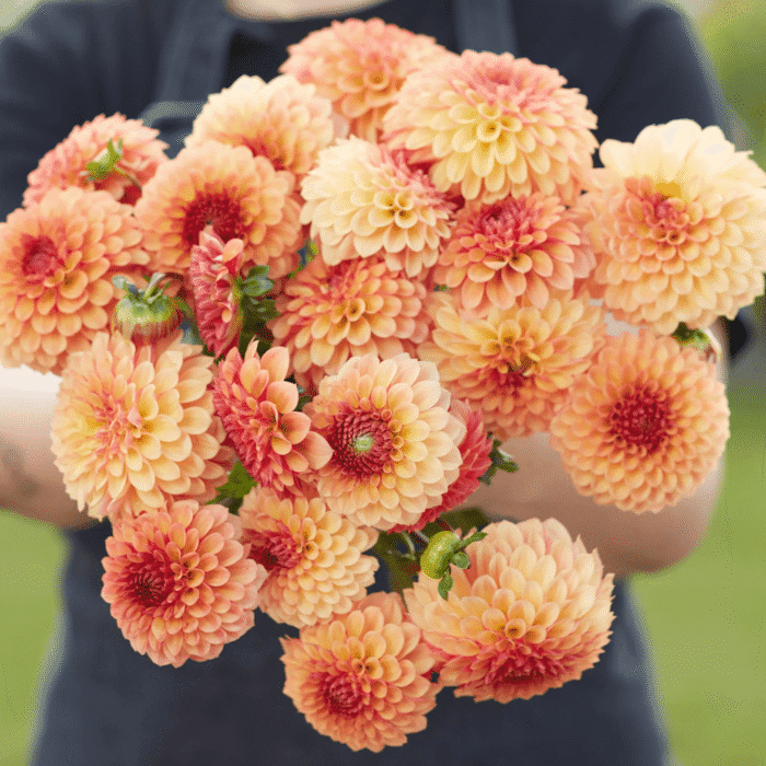 Bonaznza to przeurocza dalia o perfekcyjnie uformowanych, spiralnie skręconych płatkach. Idealnie kuliste kwiaty zachwycają niezwykłą grą barw, gdzie odcienie mango przechodzą w morelę, z delikatnymi muśnięciami malinowego różu na wierzchu płatków oraz kontrastującym, głębokim różem po ich spodniej stronie. Środek kwiatu intensywnie różowy, często z wyraźnym, zielonym oczkiem