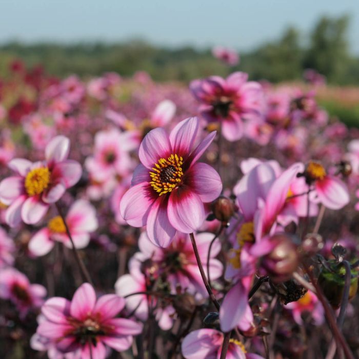 Wishes and Dreams to przeurocza, karłowa dalia pojedyncza, która wyróżnia się na tle wielu innych tego typu odmian. Kwiaty o średnicy ok. 8 cm mają różowo-różaną barwę, jaśniejącą ku brzegom płatków, z amarantowym środkiem. Intensywne kolory pięknie kontrastują z niemal czarnym ulistnieniem, nadając roślinie wyjątkową wyrazistość. Idealna do uprawy w donicach oraz na przód mieszanych rabat bylinowych, gdzie szybko staje się prawdziwą, przyciągającą wzrok ozdobą.